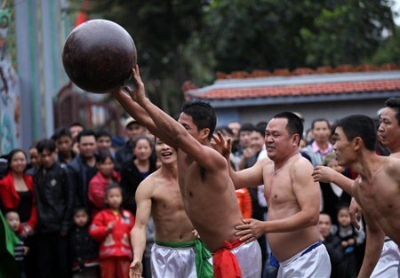 | Những tráng đinh "sức dài, vai rộng sẽ tranh quả cầu bằng gỗ mít nặng đến 25 kg. |