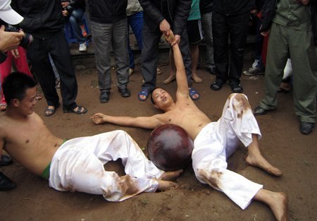 | Có thể bị đau, thậm chí bị thương nhưng nụ cười luôn nở trên môi những người tham gia trò chơi vật cầu đầu xuân. |