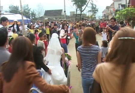 11h trưa, khi đoàn xe đưa chú rể và cô dâu từ huyện Nghĩa Đàn, Nghệ An về đến con đường đất chạy dọc bờ biển Thạch Kim, hàng trăm người đứng chật lối đi vỡ òa trong niềm xúc động khi chứng kiến một tình yêu đẹp và đáng khâm phục. Cô dâu xinh xắn, rạng ngời, khuôn mặt luôn nở nụ cười tươi nhẹ nhàng bế chú rể lên chiếc xe lăn đã được kết hoa tân hôn rồi nhẹ bước đẩy xe lăn cho chú rể vượt qua con đường đông kín người dân đến chúc phúc.