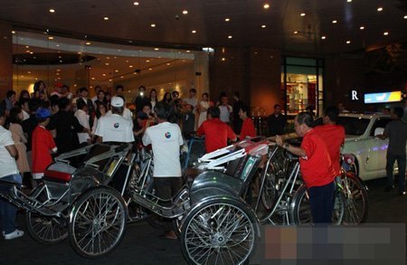 40 chiếc xích lô đưa đón những vị khách tập trung tại đại sảnh để di chuyển sang vị trí tổ chức sinh nhật kế tiếp. |