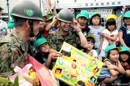 | Các thành viên Lực lượng Phòng Vệ Mặt Đất đã nhận được nhiều thư cảm ơn từ các em nhỏ tại các nhà trẻ. Ảnh chụp ngày 20/07/2011 Tp. Rikuzentakata, tỉnh Iwate |