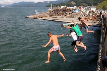 | Sau giờ tan học, trên đường về nhà các em học sinh đứng trên cầu nhảy xuống biển để lặn. Ảnh chụp 01/07/2011 tại Tp. Ishinomaki, tỉnh Miyagi |
