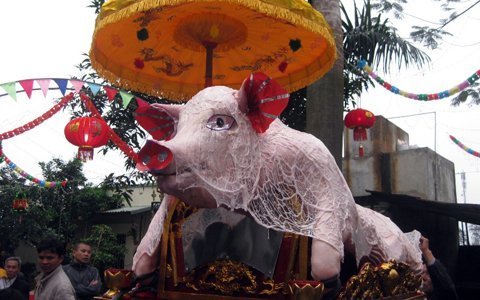 cây đèn, ống hoa. Cuối cùng là kiệu của “ông lợn” được đẩy (cách