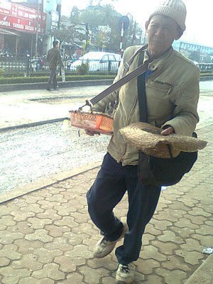 | Một cụ ông vừa đi bán dạo, vừa ăn xin tại Cầu Giấy - HN. |