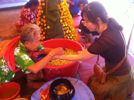 Thành tâm dâng hoa cúng Phật tại Lào |