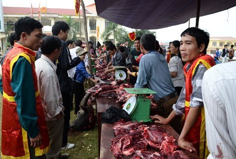 | Thịt trâu bày bán la liệt tại lễ hội chọi trâu Hải Lựu (Ảnh: Nguyễn Tuấn) |