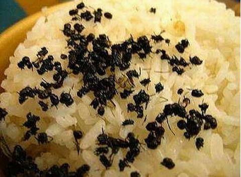 | Xôi kiến: Đây là loại kiến được nuôi đặc biệt ở Trung Quốc, nó không giống như các loại kiến thông thường mà chúng ta vẫn thấy. Những con kiến sẽ được rang lên rồi ăn kèm với xôi. Người ta cho rằng, món ăn này bổ cho thận, góp phần cải thiện tuần hoàn máu cho cơ thể. |