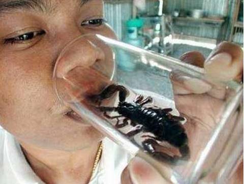| Bọ cạp: Tất nhiên là những con bọ cạp này đã được loại bỏ độc tố trước khi chế biến. Đây được cho là món ăn giàu protein nhưng không phù hợp với phụ nữ mang thai. Mùi vị của nó cũng khá ngon, giòn, hơi giống mùi vị của cua chiên. Và khi ăn tới phần đuôi có thể bạn sẽ cảm thấy hơi cứng và đắng. |