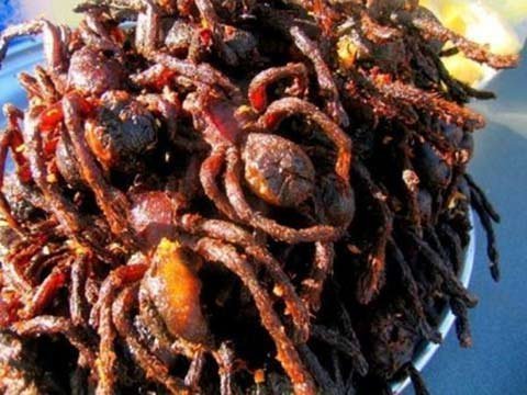 | Nhện rán: Đây là món ăn khá phổ biến tại nhiều vùng của nước láng giềng Campuchia. Từ thời Khmer Đỏ, do nạn đói kém hoành hành, người dân ở đây đã phải tìm nhện từ các hố nhỏ trên mặt đất đem về rán lên để làm thức ăn. |