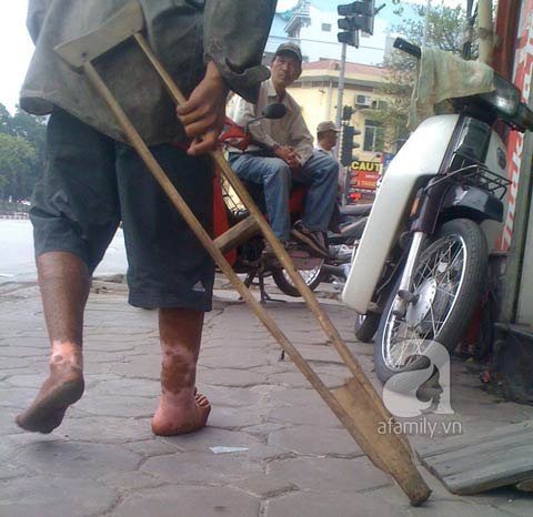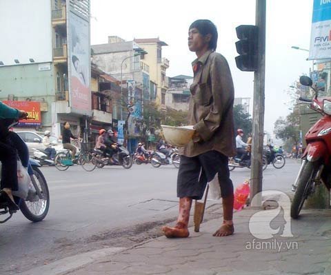 Gã ăn xin với thu nhập 30 triệu đồng/tháng lại tiếp tục xuất hiện tại khu vực Tôn Đức Thắng - Cát Linh. Vẫn là bộ dạng quần áo rách rưới, hai chân lở loét bốc mùi, gương mặt hốc hác và đôi nạng lê từng bước khó nhọc xuống lòng đường để ăn xin.