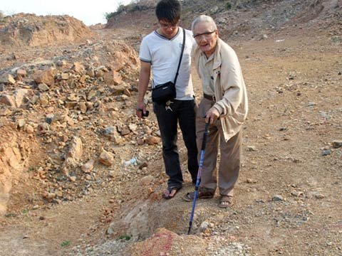 Cụ Tiệp và người con trai út trong chuyến lên núy Tàu ngày 10/3 để định vị cửa hang kho báu. Ảnh: Thanh niên |