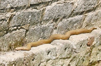 Theo đám đông xúm xít quanh miệng hang chúng tôi nhận thấy từ trong hang nhỏ ở chân tường, một chú rắn màu nâu vàng, dài khoảng 80 cm với cái đầu nhỏ từ từ trườn lên. Nhiều người mang máy điện thoại ra quay, chụp ảnh. Rắn lặng lẽ bò ra và nằm dài trên bức tường.