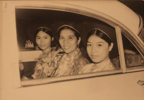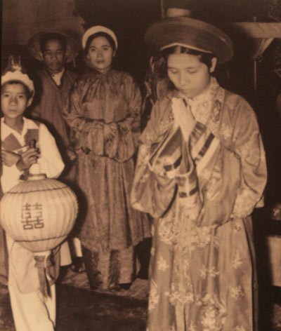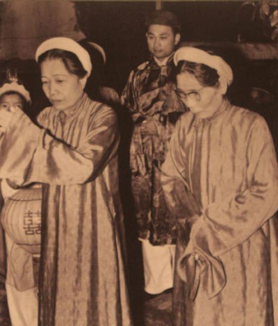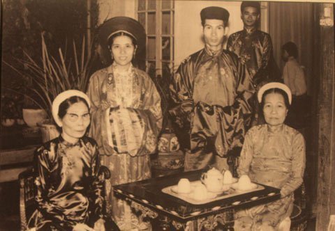 Đây là những hình ảnh về các nghi lễ trong đám cưới của ông Vĩnh Phối và bà Thạch Huệ ở Huế ngày 9/3/1969. Trong ảnh là lúc nhà trai đến làm lễ trình giờ trước khi đón dâu.