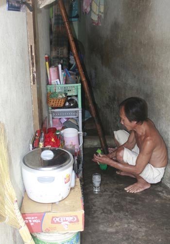 | Hẻm 185 Cống Quỳnh, P.Nguyễn Cư Trinh, Q.1, có nhiều căn nhà diện tích chỉ 3 - 4 m2. Đầu hẻm là nhà ông Trần Văn Minh, chiều ngang chỉ 1,3m, còn chiều dài hơn sải tay. Gia đình ông có 3 người, đến bữa thì phải trèo lên “lầu 1” để ăn uống, sinh hoạt, ngủ; còn chưa đến bữa thì đứng, ngồi, đi lại dưới con hẻm. |