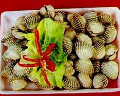 Nui 100g, sò huyết 100g, cà chua, nấm rơm, hành tây, gia vị đủ dùng. Nui luộc