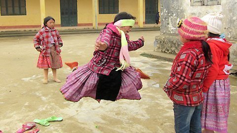 những cô gái dân tộc với trang phục đủ màu sắc, nổi bật giữa cảnh hoang sơ thanh