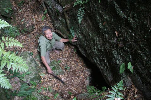 | Ông Nông Văn Lon bên miệng hang Gió kỳ lạ. |