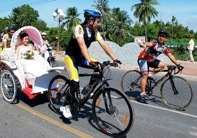 Chú rể tên Nguyễn Hoàng Nam – thành viên Câu lạc bộ Xe đạp Thủ Dầu Một (Bình Dương) – đã có một đám cưới đáng nhớ, lãng mạn, ngọt ngào ngày 23/5/2010 khi đón cô dâu Lưu Ái Vân về dinh bằng xe đạp. Đây chính là món quà độc đáo do các thành viên cùng câu lạc bộ dành tặng cô dâu chú rể trong ngày trọng đại này. Xe rước dâu chính là chiếc xe đạp của chú rể được kéo theo một chiếc kiệu trang trí lộng lẫy. Thay vì "đóng bộ" comple cà vạt thì chú rể diện nguyên bộ đồ đua xe đạp. Thật là độc đáo.