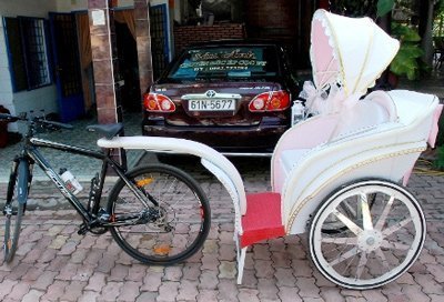 trắng có chữ song hỉ. Đứng trước chiếc xe độc đáo này cô dâu lúng túng không