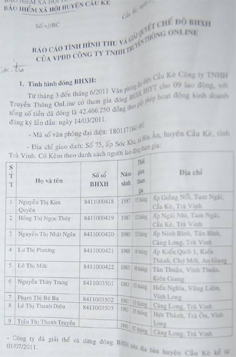 | Danh sách một số phụ nữ có bầu được công ty làm thủ tục thai sản và Giấy đề nghị công an Vĩnh Long điều tra. |