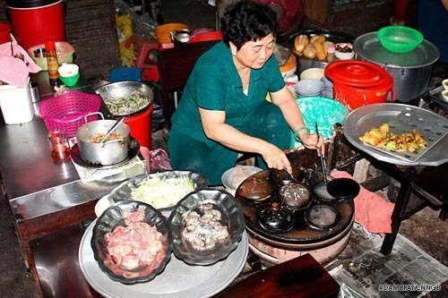 dân địa phương thường ngồi ăn trên chiếc ghế nhựa và cái bàn xếp ở ngoài chợ.