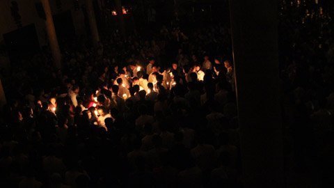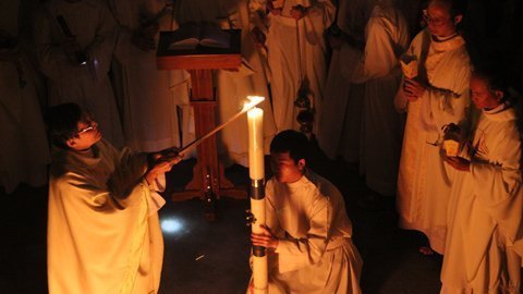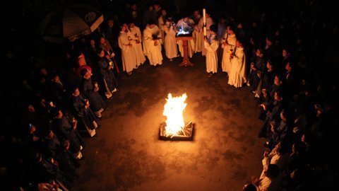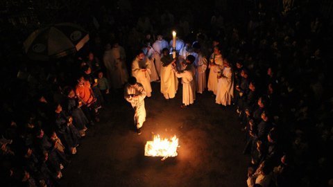 Đêm trước lễ Phục sinh, điện trong khu vực nhà thờ được tắt hết và đống lửa đầu tiên được nhóm lên để linh mục làm phép lửa