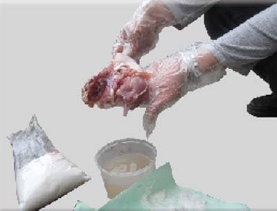 Với những mặt hàng thịt thiu có mùi, bị vữa, không thể xử lý bằng những phương thức thông thường, các chủ quán sẽ “phù phép” biến thành thịt tươi khi ngâm chúng vào chất bột trắng có nguồn gốc từ Trung Quốc thường gọi là bột săm pết, được chào bán tràn lan trong chợ Đồng Xuân (Hà Nội), chợ Kim Biên (TP.HCM). Với giá chỉ 40-50 nghìn đồng/kg, chất bột này làm thịt thiu rữa thành thịt hồng hào, tươi mới chỉ trong 15 phút.