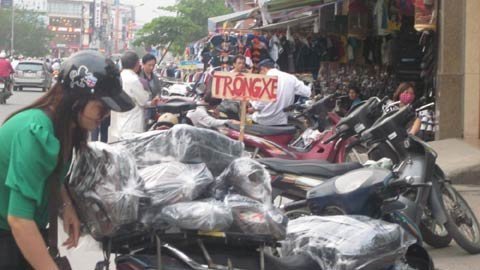 Những gian hàng quần áo chật chội nhưng vẫn được tận dụng làm bãi trông xe trên phố Xã Đàn.