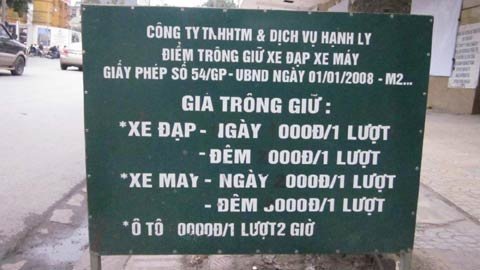 Một điểm trông giữ xe của công ty TNHHTM và dịch vụ Hạnh Ly. Giá vé bị tẩy xóa để đẩy lên cao hơn giá quy định.