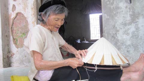 Về làng Chuông, gặp ai họ cũng đề cập đến chuyện bồi dưỡng cho nghệ nhân. Có thể là bồi dưỡng tiền, quà cáp... Hiếm lắm chúng tôi mới gặp được một người như cô Huế, cô không nhắc gì đến chuyện bồi dưỡng mà còn đón tiếp chúng tôi đon đả, nhiệt tình. Nhà cô có một mẹ già và một em nhỏ. Mẹ ruột của cô Huế năm nay đã 89 tuổi mà vẫn ngồi thoăn thoắt khâu nón. Gặp chúng tôi, bà hồ hởi kể về cái nghề làm nón đã gắn bó với bà cả cuộc đời. Từ lúc 6 tuổi bà đã biết cầm kim, lên 10 tuổi biết khâu nón rồi cứ thế bà đã gắn bó cả cuộc đời mình với cái nghề này.