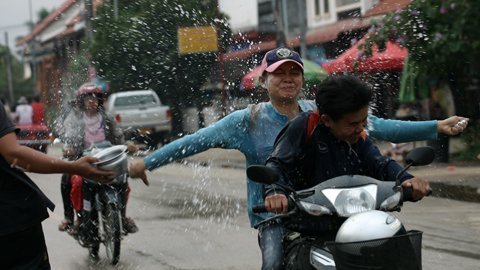 Cũng như mọi nơi trên khắp đất nước Lào, người dân cố đô Louang Prabang đang tưng bừng đón tết với tục lệ té nước mang ý nghĩa đem lại sự mát mẻ, mùa màng bội thu, ấm no, hạnh phúc.