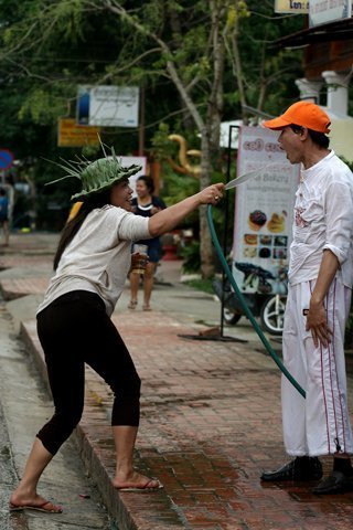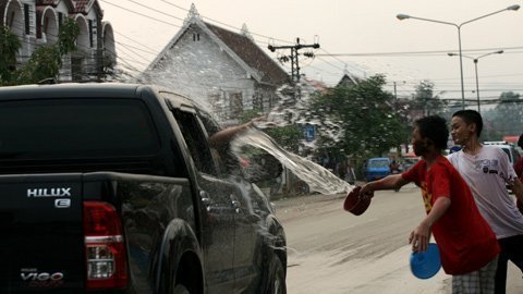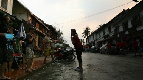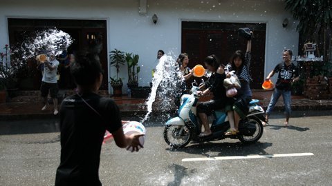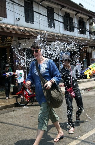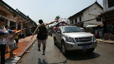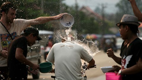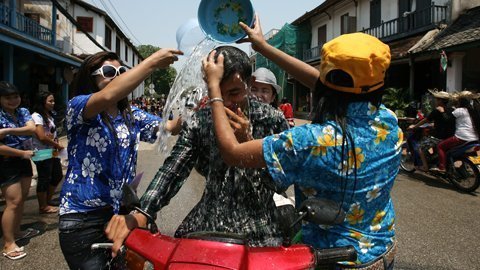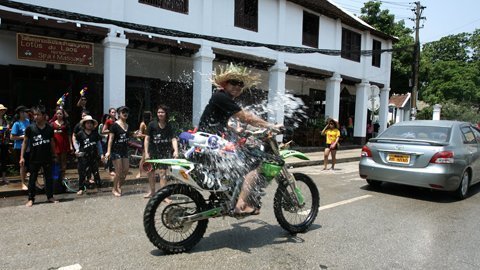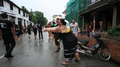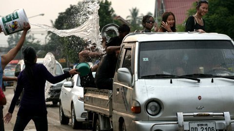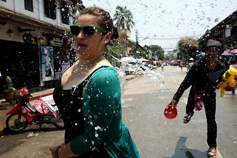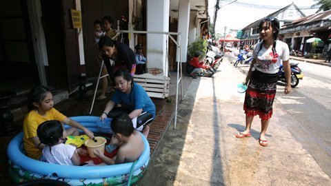 | Người dân cố đô Lào đổ ra đường với đủ loại thùng, chậu… đầy nước để té vào nhau và người đi đường chúc phúc, cầu may. |