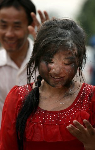 Không chỉ té nước mà bột ngũ cốc và nhọ đen cũng được sử dụng để chúc phúc. Cũng như nhiều người khác, cô gái này mang một khuôn mặt khác sau vài vòng dạo phố.
