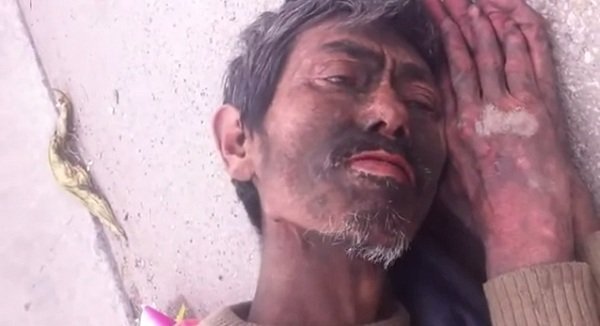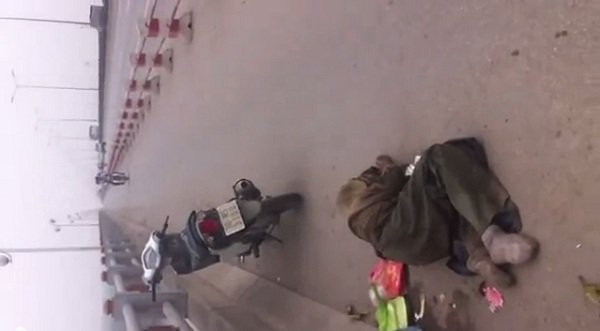 Thời tiết vào buổi chiều đúng hôm có gió mùa Đông Bắc, trời xầm xì và u ám nhưng ông chỉ mặc mỗi bộ đồ mỏng, chân mang một đôi tất rách rưới, lấm lem đất mà chẳng hề nhận được bất cứ sự chú ý nào của người đi đường. 8h tối cậu bạn này quay lại thì vẫn thấy ông nằm đó giống y như buổi chiều.