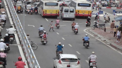 | Trước những làn xe đông đúc, sinh viên vẫn hồn nhiên băng qua đường. |