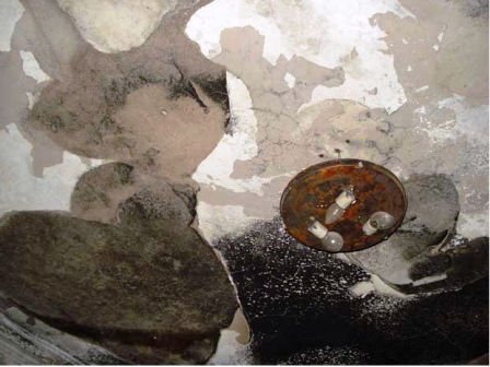| Trần nhà cháy đen, hư hỏng, loang lổ do ảnh hưởng "năng lượng đặc biệt" của bé gái gây ra vụ cháy. |