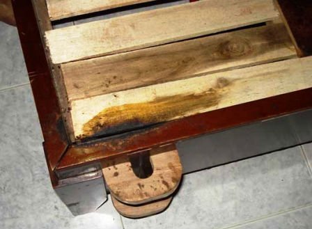 | Miếng nệm phía trên bị cháy khiến giường gỗ bên dưới bị "lây". |
