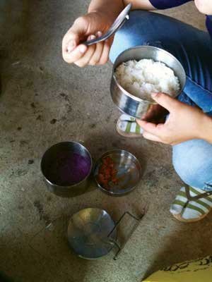 Trong xưởng giờ chỉ còn lại gần chục người, hầu hết là phụ nữ. Uể oải, bà Thành ngồi bệt xuống nền, bật nắp hộp cơm bằng nhựa mang theo, bên trong, chừng hai lưng cơm và miếng cá khô chiên cháy bằng ba ngón tay. Ít nhất, đã ba ngày nay, phần ăn của bà không thay đổi. Cạnh đó, phần ăn của bà Ba sang hơn, hai trái trứng vịt luộc, thêm chén canh suông. Hảo, người dân tộc thiểu số, chạy đi múc miếng nước đổ vào ấm điện (xưởng dùng để nấu nước sôi tẩy rửa) và bóc mì gói làm canh. Trong gần chục gô cơm trưa hôm đó, chỉ duy nhất một phần có thịt, bốn miếng nhỏ cỡ ngón tay cái. Một người biết đi chợ cũng tính ngay được không phần ăn nào quá 10.000 đồng, cho dù, công ty trả tiền ăn 13.000 đồng/bữa.