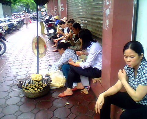 | Trong khi đó, ở phía ngoài, một phụ nữ bán mía chuẩn bị cả một chồng bìa các-tông để cho các bà bầu mượn ngồi cho đỡ mỏi trong lúc chờ khám, dù các bà bầu này có mua mía hay không. |