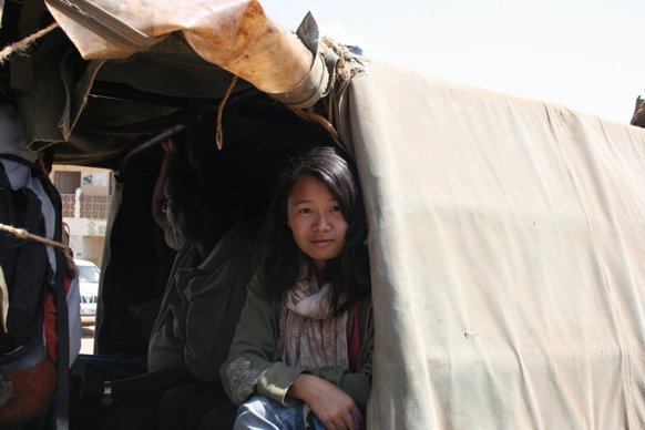 | Trong hành trình của mình, Huyền đã được rất nhiều người tốt bụng cho đi nhờ xe. Trong hình là lúc cô xin quá giang từ Ethiopia qua Kenya, trên một trong những con đường nguy hiểm nhất ở Châu Phi. |
