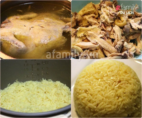 Nguyên liệu chính của cơm gà là giống gà ta được nuôi nhiều ở miền đất cát cằn cỗi, phải bới sục tìm thức ăn nên thịt chắc, da mỏng. Sau khi được chế biến gà có da vàng ươm, từng thớ thịt săn lại, thơm phức. Cơm được nấu từ nước luộc gà cùng ít nước nghệ giã, vì thế khi chín, hạt cơm ngả màu vàng nhạt, óng mượt, rất hấp dẫn.