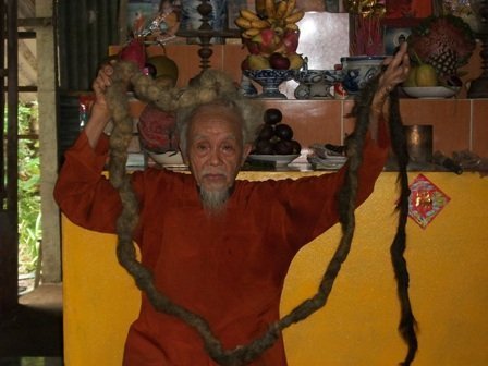 | Ông Tám đã nuôi tóc 70 năm nay. |