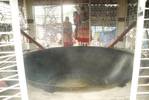 | Chảo có đường kính 3 mét, sâu 1mét, nặng 1,6 tấn, có thể nấu được 3 con ngựa cùng lúc. |