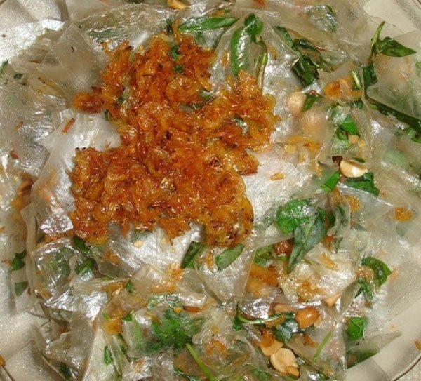 Thành phần chính của bánh là: bánh tráng cắt sợi, trộn với tôm khô chiên mỡ, phổi bò cháy, rau răm, đu đủ, sốt tương, đậu phộng... Món ăn này được bán trong từng túi bóng nhỏ với giá khá rẻ, chỉ khoảng 5.000đ/ bịch.