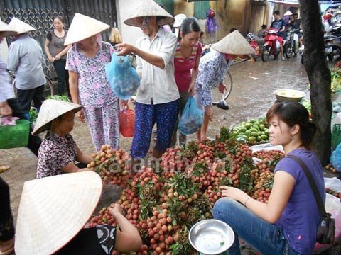 chị Phương cũng chen vàonhặt được 1 chùm vải to rồi hỏi: “Vải hôm