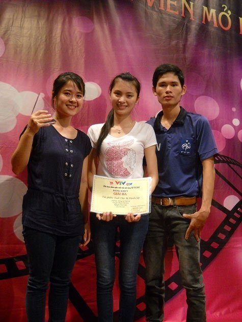 | Nhóm tác giả (từ trái sang): Phạm Hôm, Lục Lan, Văn Tuấn vui mừng khi giành giải Ba của Liên hoan Phim SV-TV mở rộng 2012 với tác phẩm "Tuổi thơ bị đánh cắp". Ảnh: Ngọc Khánh |