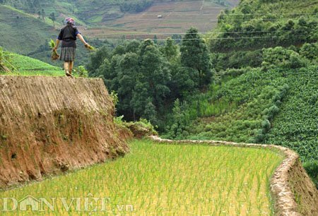 Thiếu nữ Mông “làm xiếc” trên bờ ruộng bậc thang.