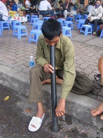 Chờ con trong phòng thi, phụ huynh tranh thủ "bắn" điếu thuốc lào để giải toả căng thẳng (Ảnh: Dân Việt)