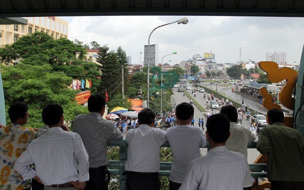 Nhiều phụ huynh đứng trên cầu đi bộ để ngóng con