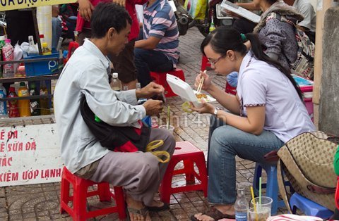 Ngồi thúc giục con ăn để lấy sức chiều thi tiếp